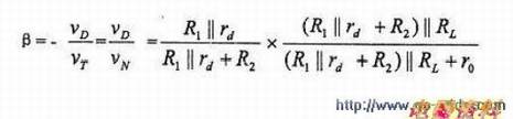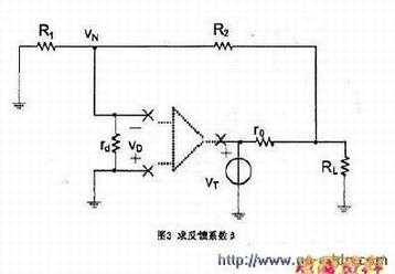 分析图1所示的放大器,这是一个典型的负反馈系统,将它等效成图2所示的负反馈电路的基本结构。其中α为该放大器的前向增益,称为该运算放大器电路的开环增益。β为该反馈网络的增益,称为该运算放大器电路的反馈系数。为了求出B,除去全部输入源,切断运算放大器并用它的输入rd和输出r0代替,以保持相同的状况。然后,经由r0外加一个测试源vT,如图3所示,求出跨在rd上的差值vD,则
