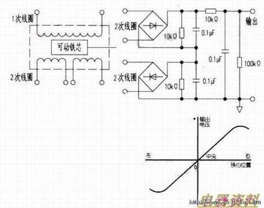 差动变压器由一次线圈、二次线圈及可动铁芯构成,如上左图。在一次线圈中加上一定电压、的正弦波励磁。通过可动铁芯使二次线圈产生感应电压,其输出特性见下图。两个二次线圈的差动输出是与励磁信号同频的交流电压,经检波变换为直流的位移电压被输出。检波电路由整流及RC组成,见上右图。