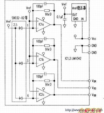 在S9032—02芯片上集成了对红(λP=620nm)、绿(λP=540nm】、蓝(λp=460nm)有高灵敏度的三只。用撼除近红外光。从而得纯正的色信号,其分光灵敏度特性见右图,传感器的内部结构见上图.