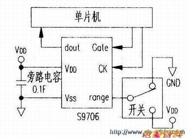 S9706是数字输出的三基色传感器。内部含有AD转换,输出12比特数字串行信号。其外部不需元件,直接与连接就可工作,电路见下图。采用一电压转换电路取出模拟信号。