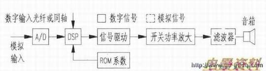 原理框图如下图所示,全数字从光纤或数字同轴电缆接口接收数字音频信号;或通过模拟音频输入接口接收模拟音频信号,经机内A/D转换后得到数字音频信号。数字音频信号通过专用音频芯片进行码型变换,得到所需要的音频数字,经过小信号数字驱动送入功率开关电路进行功率开关控制,最后将功率脉冲通过,提取模拟音频信号。由图1可知,音频数字信号经过DSP编码后,直接控制场效应管开关网络的工作状态。场效应管驱动器用来缓冲DSP并增强信号,使之能驱动大功率MOSFET开关管。然后通过积分电路()就能得到大功率原始模拟音频信息,用以推动喇叭发声。