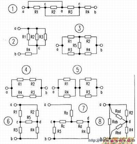 分析:利用节点法,就可将图l原电路等效为图2所示电路,由图2可知,R1、R2电阻与R3并联后,再与R4串联,即为a、b间的电阻Rab。