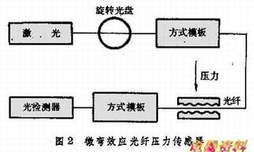 ② 光强调制型光纤传感器 在压力作用下光纤产生微弯变形导致光强度变化,从而引起光纤传输损耗的改变,并由吸收、发射或折射率变化来调制发射光,可制成微弯效应的光纤压力传感器(图2[ 微弯效应光纤压力传感器])。由于齿板的作用,在沿光纤光轴的垂直方向上加有压力时,光纤产生微弯变形,光波导方式改变,传输损耗增加。这种传感器具有较高的灵敏度。此外,利用光学盘配合光纤可制成数字式光纤压力传感器。