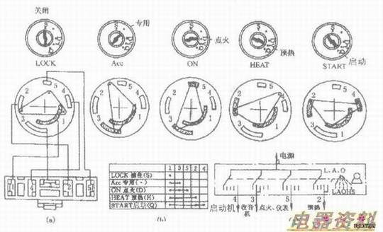 点火开关的功能主要有:锁住转向盘转轴(K挡),接通点火仪表指示灯(ON或挡),启动(ST或START挡)、为附件供电(A挡,主要是收放机专用),如果用干柴油车则增加发动机预热功能(HEAT挡)。
