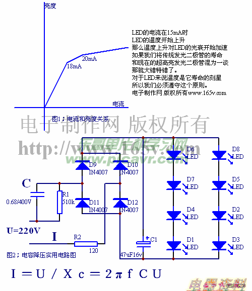 LED灯的电流与镇流C的容量有关,其关系式为:I=U/Xc=2πfCU.
