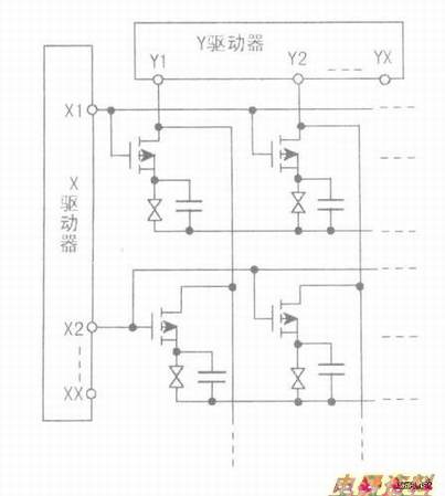 当X驱动器的X1瑞输出IH(扫描一条线所需要的时间)的扫描脉冲,使X1端所连接的TFT导通时,Y驱动器的Y1-Y)C端输出对应于RGB三基色的像素信号,通过源极母线上连接的TFT,施加到像点液晶上,改变其透光率。X1螨扫描结束后,X2端产生IH扫描脉冲,第二条扫描线的TFT同时导通,接着,按照X3、X4······Xx的顺序循环扫描。此时,所有液晶分子的透光率都随着像点信号的盘值而改变,则背光灯的光→下偏光坂→液晶膜→三基色滤光片→上偏光板→还原图像。