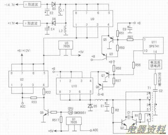 A(+l2V)经U1稳压后,输出+5V电压,为系统电路供电,使CPU(SMO8951)进入待机状态。轻触“POW”键,CPU的(39)脚断开内部电路,通过上接R517输出高,控制Q9导通,U2的(4)脚为低电平,使U2输出+l2V电压,分两路输出,一路经U3稳压后,输出+5V电压为小信号处理电路供电,另一路为U9~U11供电。U11(SP9741)是一块内置振荡电路、基准稳压电路、定时锁闭电路、误差放大电路、电路的两通道驱动控制器。