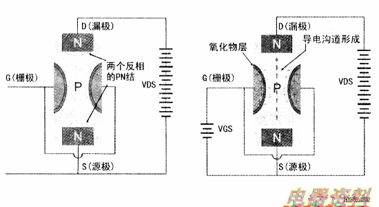 如下图A所示,从N沟道增强型MOS管结构图中可以看出,其漏极D和源极S之间有两个的PN结。当栅-源V=OV时,即使加上漏-源电压Vds,总有一个PN结处于反偏状态,漏-源极间没有流过,所以这时漏极电流Id=OA。