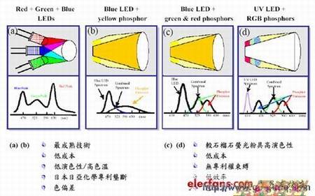 下图简要归纳并比较多种白光LED构装原理和优劣点,其中(a)型构装方式、演色性最佳,但成本最高,尚未能普及;构装方式(b)则具有技术最成熟且成本低廉之优势,但色偏、演色性不佳,须以适当红、黄光荧光粉加以改善,此外,最严重者为日亚化学专利限制难以规避;而构装方式(c)与(d)两者所制作的白光LED演色性俱佳、色偏小、成本低且专利局限较不严重,因此未来深具发展潜力。