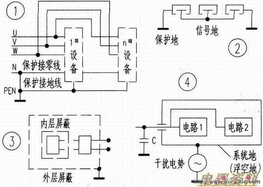 除了上面介绍的从安全角度出发而考虑的保护接地外,还必须处理好设备内部系统中各个电路工作的参考电位,这类基准参考电位的连接线称为“系统接地”。系统接地线既是各电路中的静态动态电流通道,又是各级电路通过共同的接地而相互耦合的途径,从而形成电路间相互干扰的薄弱环节。