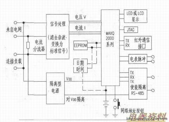 如今用户电表正逐渐朝着多费率、多功能和高精度方向发展。该新型单片电表微控制器是多功能、多费率电表,它所需的基本架构为:采集输入电压和输人电流信号的转换器、显示屏、数据通信子系统、非易失、及内嵌程序的微控制器。以Maxim的单片电表微控制器MAXQ2000为例,它在单一硅片上集成了双路16位模/数转换器(ADC),分别用于电压和电流信号的采样和转换;两个全功能异步串行通信口淇中一个可以配置为红外信号模式);一个液晶显示控制器和一个独立的16x16乘法器。另外,芯片上还集成了足够的数据、程序存储器,以满足多费率、多功能电表的复杂要求。下图是以MAXQ2000微控制器为核心的单相电表基本架构示意图。