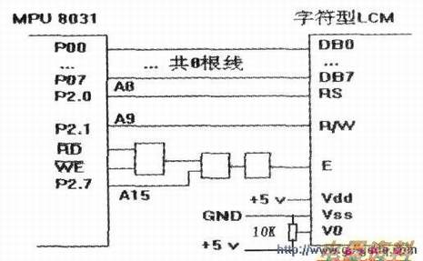 直接访问方式是把字符型液晶显示模块作为或I/O设备直接挂在单片机的总线上。下图的接口是北京精电蓬远公司的演示板电路,图中8位数据总线与8031的数据总线连接,E信号由/WE和/RD信号逻辑与非后产生,然后由高位地址组成的“片选”信号选通控制,RS信号由地址A8提供,R/W由地址A9提供。图中的电位器为液晶驱动VO,提供了可调的驱动电压,用以调节液晶模块的显示。常温型字符液晶模块的液晶驱动电压的参考值V0=0.2V.宽温型字符液晶模块的液晶驱动电压一般为负值,参考值根据具体型号而定。图中所示模块为常温型模块。
