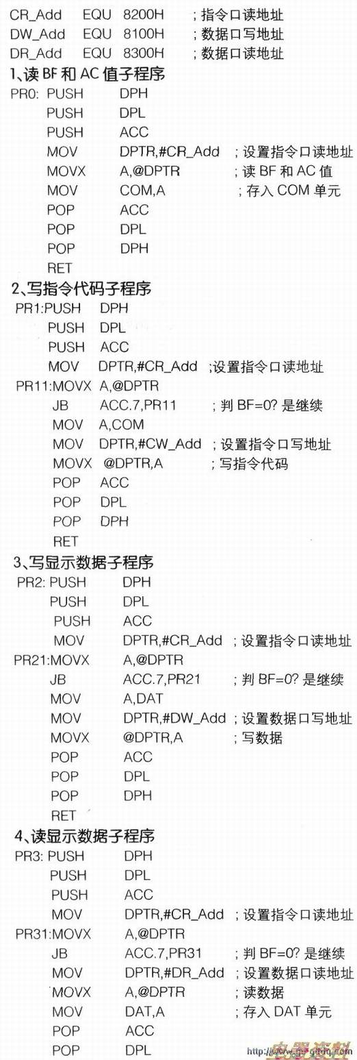 硬件电路做好后,还需要相应的软件才能实现液晶模块的显示。下面介绍应用于图1电路的最基本的一些底层驱动子程序,它们可以作为通用子程序模块进行引用、调用或链接。