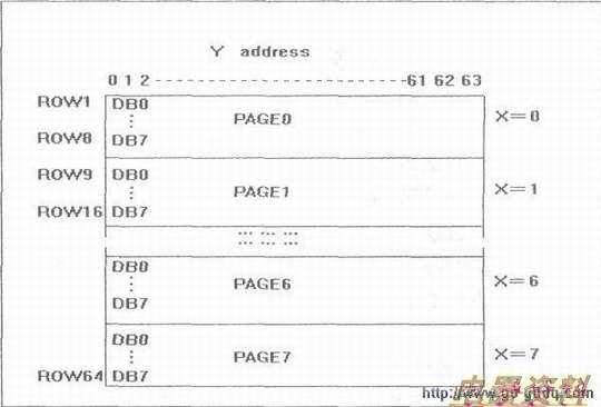 上图和下图是单色点阵图形液晶显示模块的显示区对应显示屏的两种数据格式。整图对应于显示屏,图中的位对应于显示屏上的点,由图中可以看出,上图中存储器的字节存储单元存放的是屏上纵向的8个点的显示状态,并且高位在下,分页管理,一个字节对应的8行为一页,一共64行64列8页,占用显示区64/8x64个字节单元。这种数据格式通常用于小规格单色显示模块,对应的控制器包括HD61202、SED15xx及兼容系列。