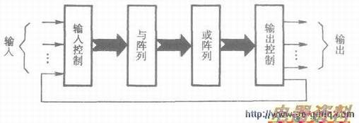 下图为可编程逻辑器件PLD的基本结构。可见,PLD器件由输入控制、与阵列、或阵列以及输出控制电路组成。在输入控制电路中,输入信号经过输入缓冲单元产生每个输入变量的原变量和反变量,并作为与阵列的输入项。与阵列由若干个与门组成,输入缓冲单元提供的各输入项被有选择地连接到各个与门输入端,每个与门的输出则是部分输入变量的乘积项。各与门输出又作为或阵列的输入,这样或阵列的输出就是输入变量的与或形式。输出控制电路将或阵列输出的与或式通过三态门、寄存器等电路,一方面产生输出信号,另一方面作为反馈信号送回输入端,以便实现更复杂的逻辑功能。因此,利用PLD器件可以方便地实现各种逻辑函数。