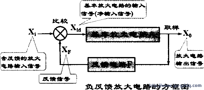 从放大输出回路中取出部分或全部的输出信号,通过适当的途径回送到输入端,对输入信号进行调控的过程称为反馈,如图所示。