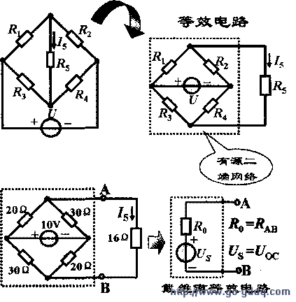 【提示】戴维南定理中的“等效代替”,是指对端口以外的部分“等效”,即对相同外接而言,端口电压和流出端口的电流在等效前后保持不变。