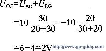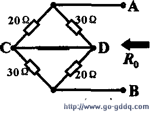 (2)求输入电阻Rab,如图所示,恒压源被短接后,C、D成为一点,电阻R1、R3和R4分别并联后相串联。即:R0=Rab=20//30+30∥20=12+12=24Ω。