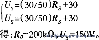 例2:如图所示有源二端网络,用内阻为50kΩ的电压表测出开路电压值是30V,换用内阻为100kΩ的电压表测得开路电压为50V,求该网络的戴维南等效电路。