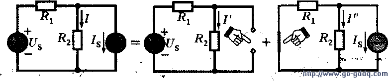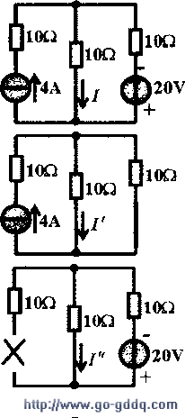 在进行叠加处理时,当恒流源不作用时应视为开路;当恒压源不作用时应视为短路,如图所示,I=I'+I"。