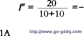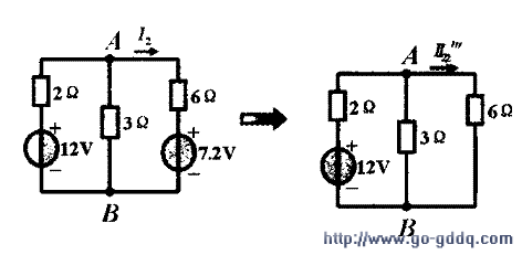 I2=I2'+I2"=1+(-1)=0例2:用叠加定理求下图中I=? 解:4A电流源单独作用时: