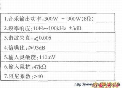 的技术指标很多,这里只介绍功放说明书中标有的几项主要性能指标,如输出功率、、、、输入灵敏度、、输出、等。下表是一台功放说明书中所标出出性能指标。