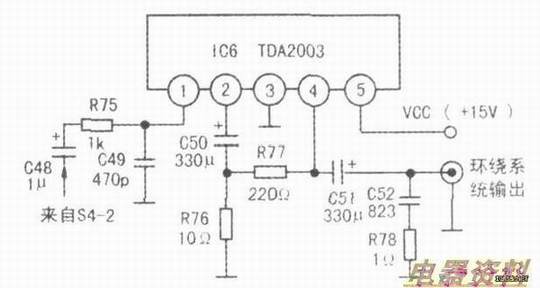 机中环绕声道只是产生环回声场效果,功率设计得比较小,常采用中功率的音频功率放大,如LM1875、LM1876、LM3886、TDA2003/A、TDA7264/A等。这些中功率集成块的内部一般都带有过流、过压、过温保护,不用另没保护电路。