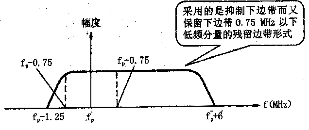 由于视频信号有6M的频带宽度,调幅的结果将会出现上、下两个边带。我国采用的是抑制下边带而又保留下边带0.75MHz以下低频分量的残留边带形式,其频谱如下图所示。
