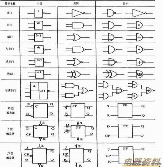 下表列出了我国新标准(GB/T 4728)的常用数字逻辑符号,同时也列出了美国、日本所应用的数字逻辑符号。