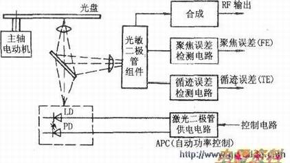 LD发射的红色激光,经过衍射光栅后被分成三束光(实际上分裂成多束光,其余的光束能量很低,不起作用),中间的一条为主光束,两侧为辅助光束。主光束用于RF信号的拾取和聚焦误差信号的检测,辅助光束则用于循迹控制。经过衍射光栅后的激光束,再经过偏振棱镜进入准直透镜,将仍具有发射性的激光变成平行光。然后,经1/4的波长板达到物镜,激光经1/4的波长板后,光束产生90度的延迟,物镜将激光束投射到碟片的信号面上。此时在聚焦伺服和循迹伺服的控制下,激光束准确地读取光碟上的信息。