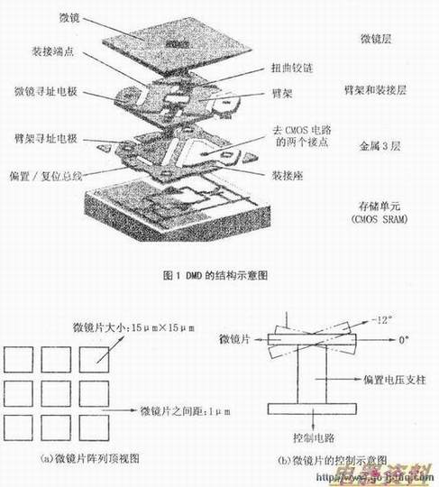 数字光学处理(DLP,DigitalLightProcessing)的核心技术称为数字微镜器件(,DigitalMromirrorDevice),它在一个拇指指甲大小的芯片上,集成了大约数百万个微镜,见图1。在电子开关作用下,.每个微镜都能在±12度的位置翻动,见图2。图像信号被转换成0、1数字代码,这些代码用来使微镜在±12度两个位置翻动。当DMD芯片和投影灯、色轮(或分色梭镜)、投影镜头同步工作时,这些翻动的镜片就能在屏幕上形成一幅彩色图像。