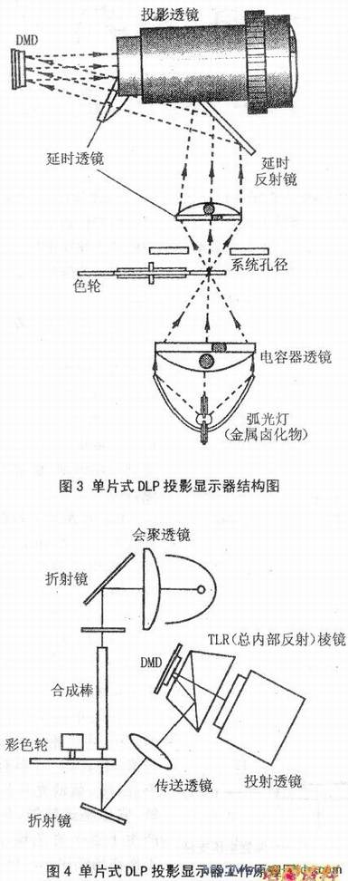 DLP投影显示器有单片式和三片式两种,单片用于廉价的便携式投影显示器,三片式用于高档投影显示器。图3所示为单片式DLP投影显示器的结构图。其工作原理图如图4所示。