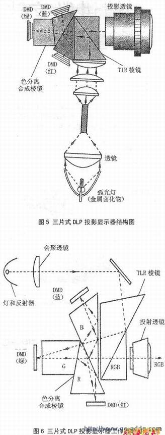 三片式DLP投影显示器的结构图5所示。工作原理图如图6所示DMD是最简单的反射式光开关阵列,不需要偏光器。金属卤化物或氖灯发出的光由会聚透镜聚光,对于正常的DMD光开关,这束光应与DMD片的法线成20。角。