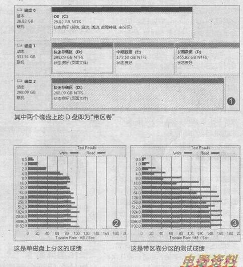 从测试结果可以看到,图2中单磁盘的读写性能上限在80MB/s左右,而图3中组成“带区卷”的分区则能达到140MB/s读速度和160MB/s写速度,在日常使用中,《英雄联盟》的载入过程变得更迅速,不再让队友等很久……当然,如果你有条件的话,将两块磁盘换成性能一致的型号就更好了(笔者使用的是西部数据的绿盘1TB,换成两块黑盘那就牛了)。