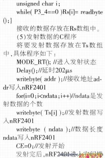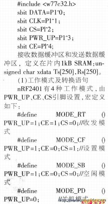 对nRF2401的编程包括对nRF2401进行配置、发送数据、接收数据等子程序。首先定义如下: