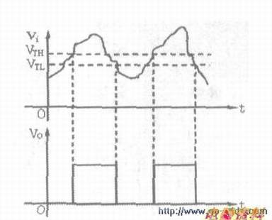 2、波形整彤可将不规则波形变换成规则波形,如中图所示。如对边沿较差或带有干扰、噪音的不规则波形进行整形。
