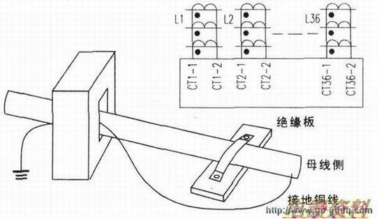 一般电缆出线采用零序电流互感器CT获得零序电流。安装电流互感器应确保零序电流信号不被短路。若电缆头在霉序电流互感器与短路器出线之间要固定电缆,绝缘板上的固定螺栓应保证卡子与地绝缘,母线侧电缆外壳的接地线应穿过零序CT再接地(如下图所示)