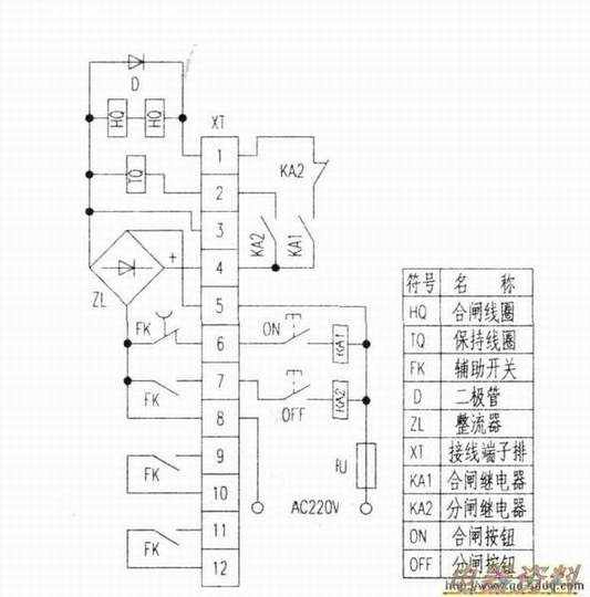 真空接触器在结构上为上下布置方式,由真空灭弧室、绝缘框架、绝缘子、拍合式合闸电磁机构、机械锁扣机构(机械保持方案用)和底板等组成。绝缘子、绝缘框架实现高压回路对地及桕问的绝缘和支撑。控制回路由桥式、合闸线圈、分闸线圈(机械袁1CKC3系列交流高压真空接触器的产品技术参表3JC25-7.2/12型高压真空接触器主要技术参数保持方案用)、保持线圈(电保持方案用)、辅助开关及器等组成,接线圈见上图(电保持方案)和图4(机械保持方案)。其中,对于电保持方案,保持线圈与合闸线圈串联用以实现接触器长期合闸保持,而电容器用来消除辅助开关常闭触点转换合闸回路时的电火花,从而提高辅助开关常闭触点转换合闸回路的稳定性和可靠性。当接到合闸指令时,即按压合闸按钮ON后,交流110V或220V经桥式整流加到合闸线圈两端,合闸线圈通电,衔铁动作,使与其固定连接的方轴旋转,固定在方轴上的拐臂向上推动绝缘子,带动灭弧室动导电杆向上运动,接触器合闸。合闸后常闭辅助触点FK断开,保持线圈HQ2串人,合闸状态得以保持。对于机械保持方案,合闸保持由机械锁扣来实现。相反,接到分闸指令,即按压分闸按钮OFF后,分闸线圈TQ(产品资料中使用的符号.下同)通电(见下图).机械锁扣机构解扣;或保持线圈HQ2回路断电(见上图),由分闸弹簧作用使衔铁释放,方轴通过拐臂和绝缘子带动灭弧室动导电杆向下运动,接触器分闸。