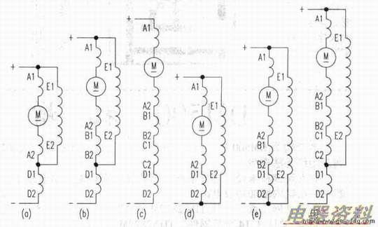 复励式复励式直流电机的主磁极励磁绕组有两个,一个与电枢绕组并联,另一个与电枢绕组串联(其中并励绕组用El、E2表示,串励绕组用Dl、D2表示)。这类电机有6种类型,其接线图分别见下图(a)、(h)、(c),、(d)、(e)、(f)。