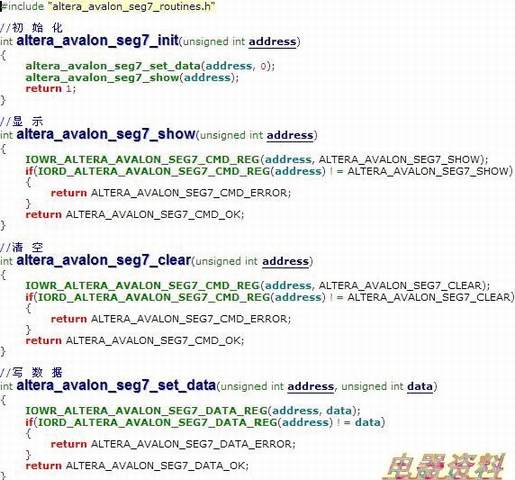 函数功能从字面上很好理解。刚才定义两个寄存器时,data_reg在前面,所以偏移量是0,cmd_reg在后面,偏移量是1。××_REG_MSK称 为掩码,avalon总线数据接口共32位,但我们设计的data_reg位宽是3,cmd_reg位宽为1,掩码的作用在于告知寄存器宽度,知道就行, 实际上用不着。××_REG_OFST是寄存器内的偏移量,这里同样用不着,先写上吧。