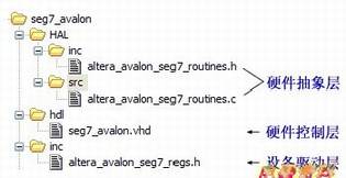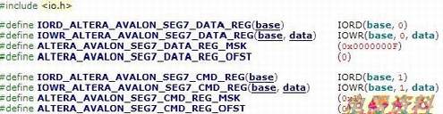例如,数码管设备驱动要把数据“5”和“显示”命令传给数码管控制器,设计两个函数,由于数据和命令的传递必须经过总线,那么需调用总线驱动函数IOWR(基地址, 偏移量, 数据),另外,读取寄存器用到IORD(基地址, 偏移量),这两个函数在<io.h>里。