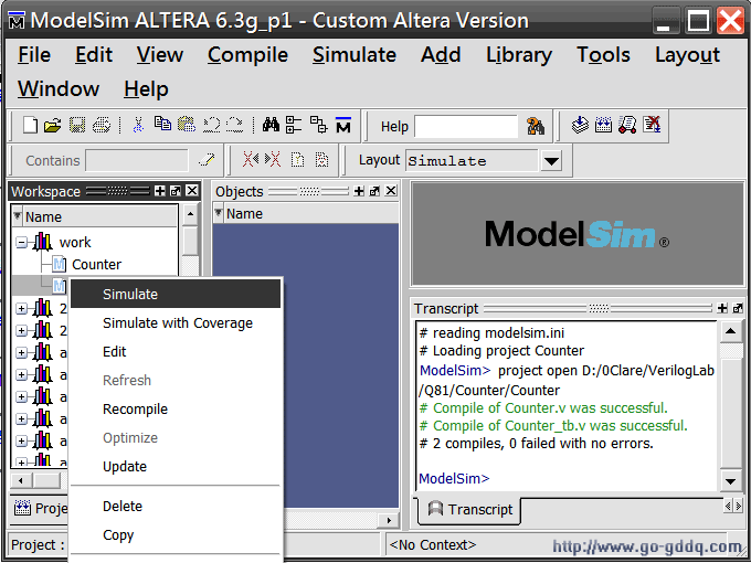 在Library tab选择Counter_tb,按鼠标右键,选Simulate。