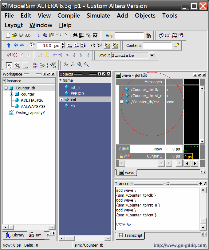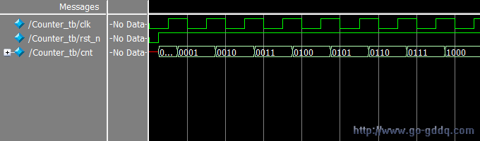 将欲观察的信号从Objects加入Wave,加入clk,rst_n与cnt。