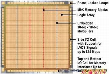 Cyclone III系列包括高达120K的垂直排列逻辑单元(LE)、以9-Kbit (M9K)模块构成的4Mbits嵌入式、嵌入式乘法器以及被I/O单元(IOE)围绕的,如图1所示。高效互联和低斜移时钟网络为时钟和数据信号结构提供连接。