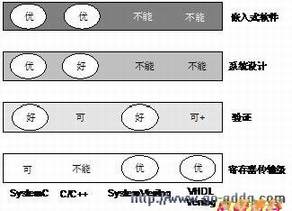 当然,SystemC可以用于验证平台和描述RTL结构,而SystemVerilog也可以用于编写高层事务处理级模型。但是,每一种语言都用于自己的重点应用时,它们可以达到最佳的效率。这点对于复杂的项目特别适用,在这种项目中,不同的任务分属于不同的组,通常有不同的技能要求。注重实效的解决方案以及符合设计团队的多种技术要求的方法是同时使用SystemC和SystemVerilog来开发和验证当今设计流程需要的虚拟原型的事务处理级模型。图1-3比较了常见语言的描述能力。其中横线代表描述能力,而跨越某一条横线则代表该语言与有能力描述该横线所代表的能力,未跨越的横线表示该语言不具备相应描述能力或者描述起来非常困难。图1-4给出了不同语言的同一描述能力时的更加详细比较,通过优、好、可以、不可以来划分。