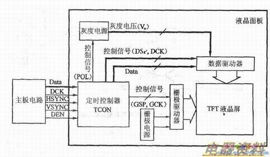上图表示了TFT(薄膜)液晶屏驱动系统的框图,实际上就是一个TFT液晶面板框图。从图中可以看出,从主板送来的图像数据加到定时控制器电路,并传输到数据驱动器。TCON以主板送来的垂直同步信号(VSYNC)、水平同步信号(HSYNC)、数据传输时钟(DCK)以及允许数据传输信号(DEN)为基础,产生各种控制信号。灰度产生将数字数据转换为时的基准电压(灰度电压:Vn)。栅极产生栅极驱动器的输出电压(VGH、VGL)。
