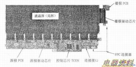 为便于理解,下图给出了TFT液晶屏中内部驱动系统的实物图。需要说明的是:这部分电路安装在紧靠液晶屏的PCB上,非专业人员对于这部分电路不要试图去拆卸和维修,以免损坏液晶彩电或扩大故障。