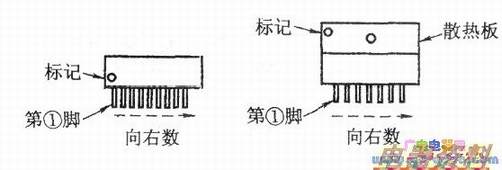 单列直插式的引脚如下图所示。识别时面对印有商标的正面,并使其引脚向下。一般在集成的正面左边会有凹坑、色点、小孔或缺角等定位标记。定位标记左下方为第①脚,从左至右依次为①、②、③……脚(按逆时针方向数的一个特例)。