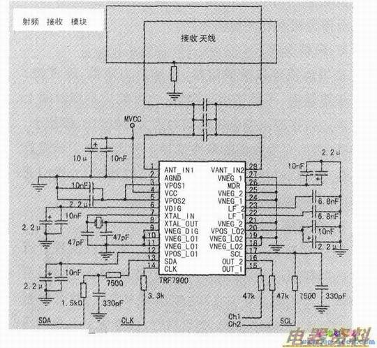 鼠标运动和按键等信息被接收器的天线接收下来,并通过射频接收模块的处理后经由USB单片机输入单片机的USB口。接收器的电路图见下图。