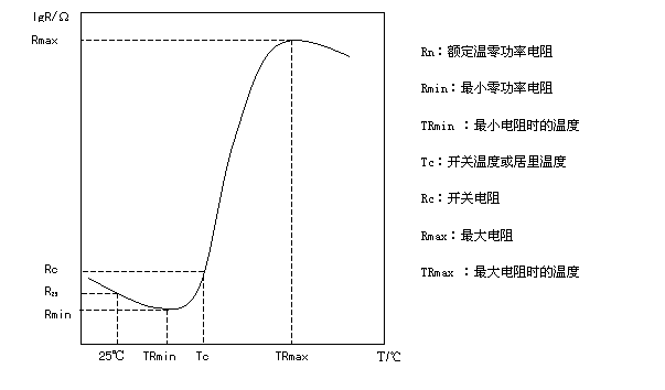 开关温度(Tc):当阻值开始呈现阶跃性增加时的温度为开关温度,即当阻值升至2倍最小电阻值(Rmin)时所对应的温度,也称居里温度。
